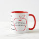 Two red outlines of apples are positioned on either side of this product. Quotes are printed in each apple. One says, "Teaching is the one profession that creates all other professions." The other apple says, "The best teachers teach from the heart, not from the book." Between these two apples are the words: This cup belongs to Mr. Andersonville, Sixth Grade Teacher, Memorial Grade School (all of this can be personalized). All words are printed in black.