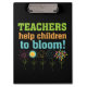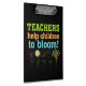 A cute clipboard for teachers or anyone who admires teachers and the work they put in to educating! Features pretty doodle flowers and colourful text of orange, green, and blue that reads Teachers help children to bloom!