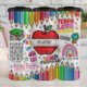This vibrant graphic celebrates educators with a lively collage of uplifting phrases and school-themed icons. It prominently features a large red apple, rows of colourful pencils, stacked books, and a vibrant rainbow. Messages like "INFLUENCER MOTIVATOR EDUCATOR" and "teachers plant the seeds that will grow forever" highlight the profound impact of teaching.