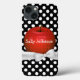 Pretty iPhone case with graphics of a small flower pattern on juicy red, against a black and white polka dot background. Graphics of a white ribbon and bow runs across the bottom of the apple. Personalise the white text. Great for yourself or as a gift idea for your favourite teacher.