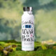 Reusable water stainless steel water bottle makes a fantastic teacher's Christmas or holiday gift. Teaching is a work of heart in black and white text with heart, star, and banner accents in blue, teal and pink. Customise with teacher's name or any other text.