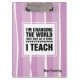 "I'm changing the world one day at a time. I teach" Teaching Quote | Typography Art Thank You Teacher / Happy Teacher Appreciation Day / Happy Teacher Appreciation Week / Graduation / Birthday / Any Occasion Gift Clipboard for Teacher with personalised name. Matching cards, favours and gifts available in the Business / Occupation Specific / Education Category of our store.