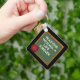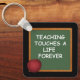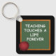 Old school green chalk blackboard with a wooden frame with a red apple in the corner, the wording - in a hand printed style, TEACHING TOUCHES A LIFE FOREVER. Personalise the back with your name or message. The background is shown in black, which can be changed to any colour you prefer. The personalisation font, colour and size on the back can also be changed to suit. **Designed for square keychains.