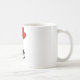 Whimsical graphic features teacup and finch silhouette with red heart balloons.