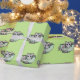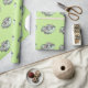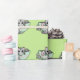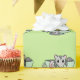 Four grey and pink possums in and around a green and pink teacup. The largest possum looks amused while the smaller possums play and clamber around the teacup.