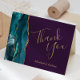 This elegant modern wedding thank you card features a teal blue watercolor agate border trimmed with faux gold glitter. The customisable text combines the words "Thank You" in gold-coloured handwriting script and the names of the bride and groom in italic font on a purple background.