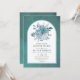 Teal and aqua blue flowers and arch summer wedding invitation. This awesome wedding design displays an arch frame on teal stained background. In the frame there is a dalia and rose flowers, foliage and pampas grass.