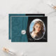 This dramatic teal and black floral damask photo Quinceanera invitation has a PRINTED ON ribbon and silver grey crystal jewelled medallion with a tiara or crown on it, and has a photo template area