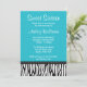 This fun zebra sweet 16 invitation is easy to personalise for your birthday party. The design features a black and white zebra print pattern and teal blue polka dots. Use the online template fields to change the text for your event.