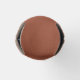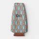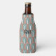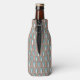 This bottle cooler has an art deco design of arches and upside-down Ys repeating across the design in teal and copper on a field of white.