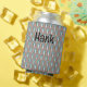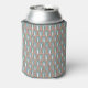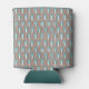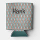 This can cooler has an art deco design of arches and upside-down Ys repeating across the design in teal and copper on a field of white. Keep the name, change it, or delete it completely. Want different colours? Message me.