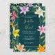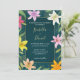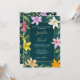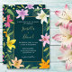 Elegant and colourful tropical wedding invitation perfect for spring and summer weddings. The design features a golden frame with tropical leaves in shades of gold on a teal background. Colourful hand-drawn lily flowers give the invitation a joyful look. The watercolor floral design comes in yellow, orange, pink, red, purple, white and green colours. A matching colourful floral pattern is at the back of the card. Personalise the card by adding your names, date, event details, etc. For matching wedding items please browse my Colourful Gold Tropical Lily Wedding Collection.