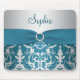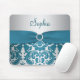 This elegant looking teal and silver damask mousepad has a faux ribbon and crystal brooch. Customise it with your own name, monogram, or other text.