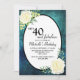 Teal and white grunge watercolor 40th birthday party invitation / "40 and fabulous" with white roses and grapes.