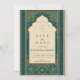 An opulent Islamic wedding design featuring a teal and gold arched frame inspired by mosque architecture and Persian artistry. With intricate floral motifs and geometric symmetry, this invitation exudes elegance, spirituality, and timeless cultural refinement — ideal for a luxurious Islamic wedding.