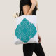 This tote bag has an art deco quilt-inspired design of diamond shapes and a rectangle, both in teal and silver.