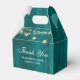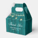 Rustic teal wedding thank you favour box featuring string lights on a barn wood background.