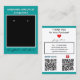 Handmade Jewelry by Name in white typography against teal blue background. Crafted with Love written in black script (keep or insert short tagline, or delete to leave area blank). Name will appear on front and backside. Two Small Circles against black and white framed background. NOTE: Circles are not pre-cut, you will need to use a small hole punch to make clean cut holes, to then place your Earrings in. Backside: Insert telephone number, email address, website, social media handle, as needed. Insert Your Business QR Code on left-hand side for customers to Shop 24/7, and Pinterest (or other) social media link site QR Code on right-hand side (leave Pinterest icon, or insert other social media icons, or delete icon). Original Design by TamiraZDesigns.