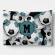 This soccer themed zipper pouch features a random pattern of varied size teal, black and white soccer balls turned every which way on a black background - customise with the soccer player's monogram - by katz_d_zynes
