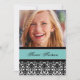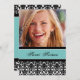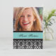 Custom Photo 16th Birthday party invitations in elegant black and turquoise blue classic floral damask pattern. Add your name, photo, and party details for a unique and stylish sweet 16 birthday party invitation.