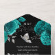 A beautiful all-in-one luxurious and glam invite featuring mother of pearl butterflies flitting across a black background that has deep teal blue roses edged with faux silver sprigs. The outside is a delicate pastel grey colour and the lift up flap has the same black with delicate floral design. The bottom third has a tear off response card with personalised rsvp address and meal options for your guests to complete. These are ideal for a spring; summer; fall or winter wedding; for a red and black theme party or for a luxurious and elegant themed wedding anniversary celebration.