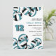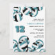 This volleyball themed party invitation for a birthday or team party features clusters of teal, black and white volleyballs at the top and bottom edges on the front and a single cluster covering the back of the invitation - customise the party details on a white background - by katz_d_zynes