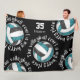 This fun volleyball themed fleece blanket features 5 randomly arranged teal, black and white volleyballs with the text, "The volleyball court is my happy place" in white encircling each volleyball in a casual handwritten font, all on a black background - the volleyballs' teal & black panels are blended with an artsy, girly floral pattern for a textured appearance - her name and jersey number are customisable - by katz_d_zynes