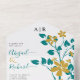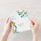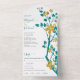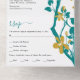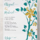 Teal blue and gold branch with flowers, initials and script typography wedding all in one invitation. A lovely design for your wedding featuring a branch with blossoms on white background.