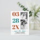 Teal blue and rust two photo Save the Date postcard. It showcases the date in teal and rust typography in a column and two photos of the couple. The phrase "Save the Date" is in script style typography.