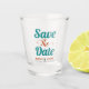 Teal blue and rust typography and names Save the Date Shot Glass.