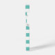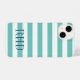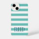 Teal blue and white nautical stripes custom name iPhone 14 Case. Cute maritime theme phone cover with bold stripe. Personalised background colour. Add your own name or monogram initials. Cool Christmas or Birthday gift idea for men, women and kids.