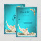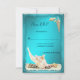 Beautiful seashells on white beach sand stand out against the turquoise teal blue aqua background and wave like frame. Add your own text to customise this beach seashell wedding RSVP card.