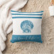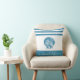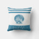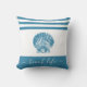 “Beach life”. Whenever you relax on this seaside throw pillow, you can be rest assured the summer seashore fun will continue. A graphic, teal blue vintage seashell overlays a crisp, white background with nautical teal blue stripes. Both indoor and outdoor fabric choices available. Great for the family beach house, your coastal lifestyle, or just to bring a bit of the beach into your home all year round!
