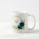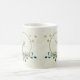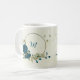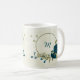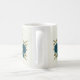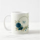 Beautiful romantic coffee mug featuring teal blue and beige flowers and some leaves .