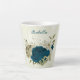Beautiful romantic latte mug featuring teal blue and beige flowers and some leaves .