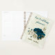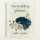 Beautiful romantic wedding planner featuring teal blue and beige flowers and some leaves .