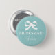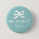 Personalised teal blue and white bridesmaid buttons with little bow tie and elegant font. Great for bachelorette party, bridal shower and beautiful weddings. Classy round design. Posh and cute! Make your own for maid of honour, matron of honour, flower girl, mother of the bride etc.