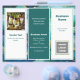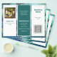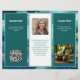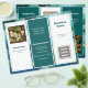 Tri-fold business brochure template. Pretty, swirling shades of blue-green create the background for three panels each side. Provide information about the business or service, with an "about" section with photo template at the top. Include a logo, QR code and two photos also. Panels alternate between white with dark teal text teal with white text. The 8.5 x 11 inch paper will be folded by the purchaser. Check all text for accuracy, as no proofreading will be done before shipping.