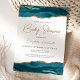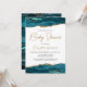 This trendy baby shower invitation features a top and bottom border of watercolor agate geode in shades of teal blue with faux gold glitter highlights. The words "Baby Shower" and the name of the mum-to-be appear in gold-coloured handwriting script. Add the party details in charcoal grey on a white background. A matching teal and gold agate image appears on the reverse side.