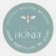Personalise with your apiary name and address, honey net weight and any honey descriptors (pure, raw, clover, etc.). Vintage bee design in centre. White text and illustration on a blue-green background. Common honey net weight conversions: 8oz (227g), 12oz (340g), 16oz (454g), 32oz (907g), 5lb (2.27kg).