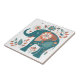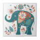 A boho style teal blue elephant is profiled on this unique ceramic tile. A large white flower decoration is on his ear, and lighter blue and orange leaf accents fill the silhouette image. The image is placed on a white background, with matching flower and leaf decorations surrounding it.