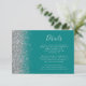 The left-hand edge of this elegant modern wedding details enclosure card features a silver faux glitter design. The customisable text combines pale silver grey handwriting, copperplate and italic fonts on a teal blue background. The reverse side features a matching teal and silver glitter design.
