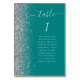 The left-hand edge of this elegant modern wedding table number card features a silver faux glitter border. The word "table" appears in silver grey whimsical handwriting script on a teal blue background. Add the names of your guests who are assigned to each table.