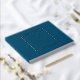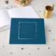 Solid teal blue colour, simple wedding guest book with stylised foil print within a square border that features the bride and groom's name along with wedding date in your choice of colour foil print. Seen here in silver foil print. Select your guest book style.