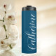 For your wedding bridesmaids! Keep hot beverages hot and cold beverages cold with this trendy, insulated thermal tumbler that is a teal blue colour along with bridesmaid's name printed in white, stylised script. Edit your thermal tumbler and replace name with your own bridesmaid name. Available in many, popular bridesmaid wedding colour schemes.