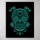 Teal Blue Sugar Skull with Roses on Black Poster