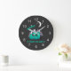 Camper theme wall clock with inspirational slogan "Home is where you park it", which can be edited to your own words. Printed with an image of a teal coloured teardrop style travel trailer against grey abstract mountains. moon and stars. Your choice of round or square. See more trailer themed designs and gifts at Camp_and_Cottage on Zazzle.