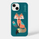 A colourful, cute fox wears boho style tribal attire and holds a pattern feather. The image, in orange and turquoise, is placed on a darker teal background. Your name or other text is in matching light teal at the top. Unique and trendy!
