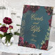 A teal blue jewel tone "Cards & Gifts," wedding self-standing pedestal sign featuring a symphony of deep bordeaux raspberry red peonies embellished with gold spray and shimmering gold outlines gather around a deep teal blue watercolor-wash background, your names and numeric date appear underneath.