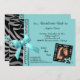 Teal ribbon and silver pearls with black and silver zebra stripes decorate this contemporary party invitation. Upload your own photo to the funky zebra frame to further personalise the look. There is plenty of customisable text on this trendy invitation to add your party information. We also have this design in various colours. Coordinating colours on the back of this plush invitation complete the look and makes this premium design perfect for almost any occasion.